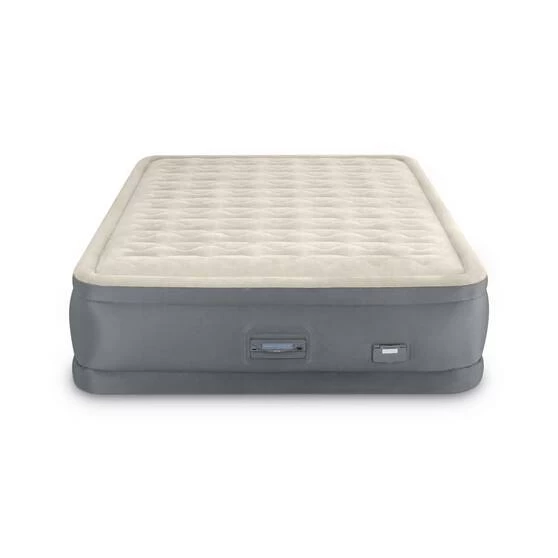 Get a solid night of sleep with the Intex PremAire II 240V Pump Queen Airbed with its luxurious velvety comfort top. Ideal for ensuring guests in your home are happy and comfortable over the holidays, with heavy-duty 2-ply laminated sidewalls and bottom for durability. The revolutionary, patented Fiber-Tech™ support system provides the perfect combination of superb structural stability and support. With the newly designed pump panel with a firmness control dial and USB port, your comfort and convenience are guaranteed. Intex has added a convenient storage compartment for cords and small personal items and the 2-in-1 included valve for easy inflation and deflation with a manual pump.