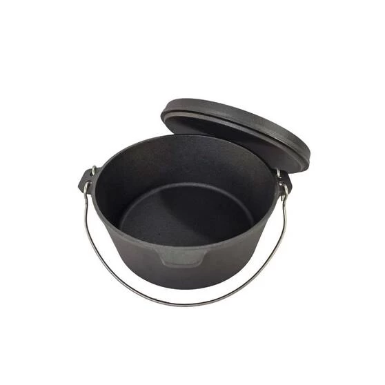 - Set contains: 3.5L camp oven with lid, 25cm frypan, leather glove, lid stand, 20cm trivet, lid lifter and a wooden storage crate