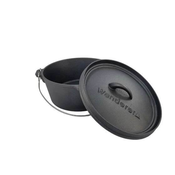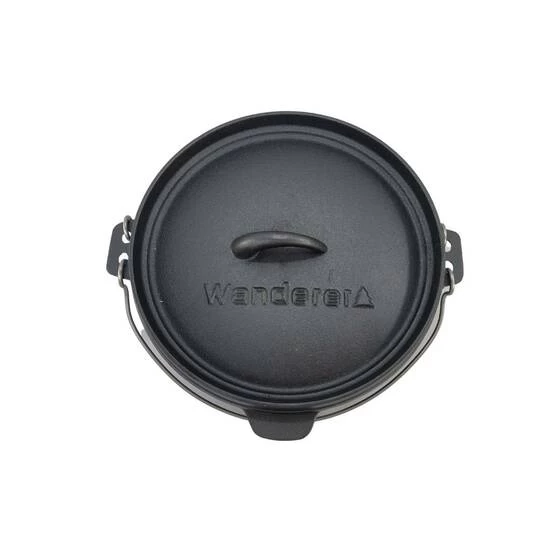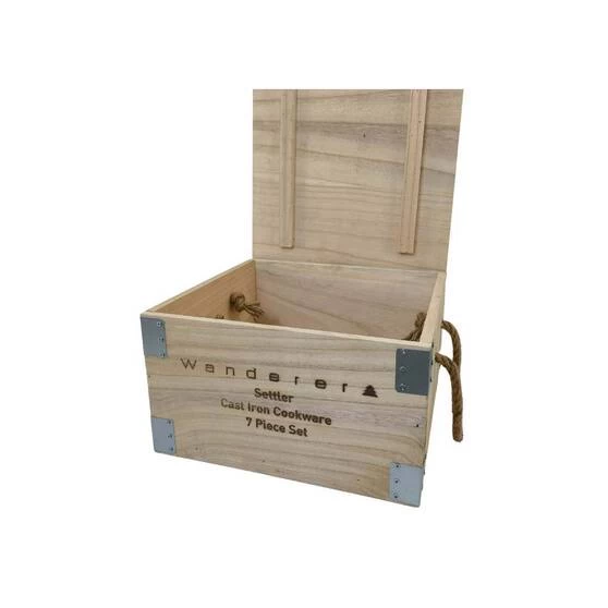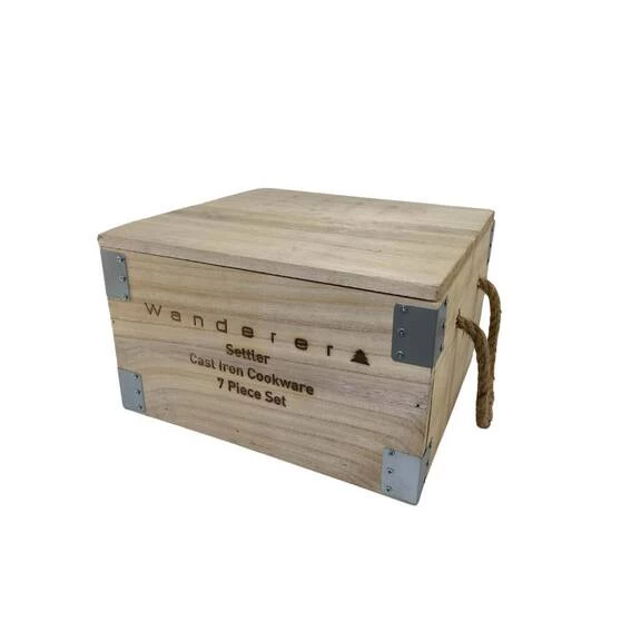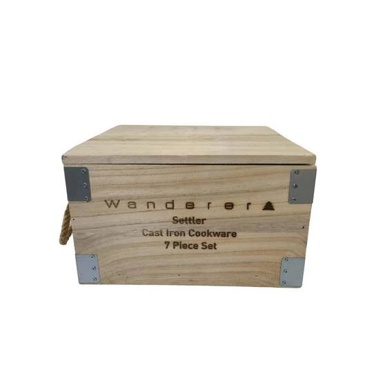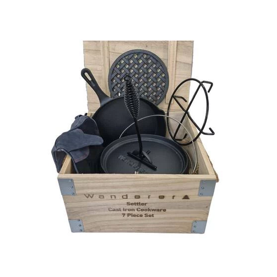 If you’re looking for a cooking set for your next camping adventure then dont look past Settler 3.5L Cast Iron 7 piece set by Wanderer. This set has everything you need to make cooking over the campfire a breeze. The Settler 7 piece set comes with a 3.5L/4.5QT camp oven with trivet, perfect for baking and cooking over the coals. It also includes a 25cm frypan for frying up your bacon and eggs in the morning. A lid lifter, lid stand, leather glove and a handy wooden storage crate are also included. This set is pre-seasoned and ready to use. No need to muck around getting it ready, simply take it out of the box and start cooking up a storm! So if you want to make life easier on your next camping trip don’t look past the Settler 3.5L Cast Iron set by Wanderer.